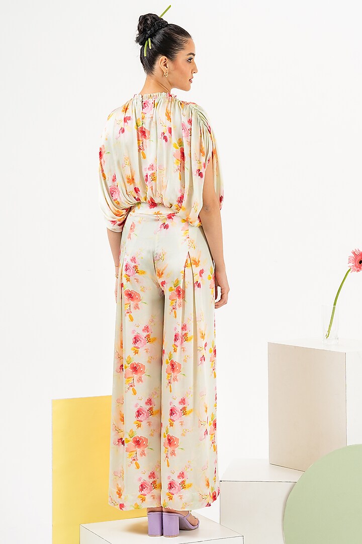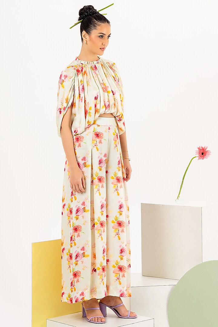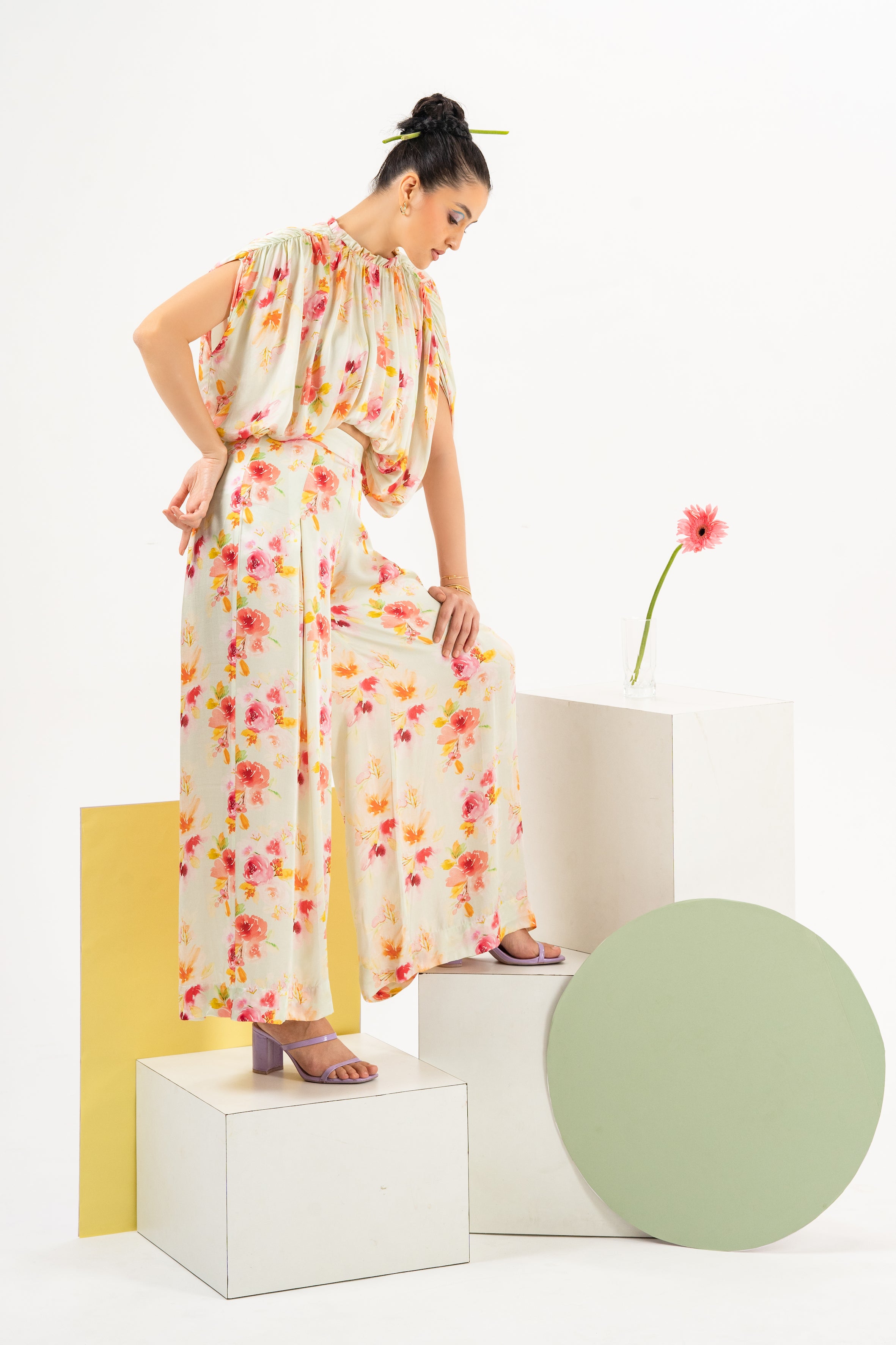 Mint floral gathered dolman sleeve crop top with pleated pants in modal silk.