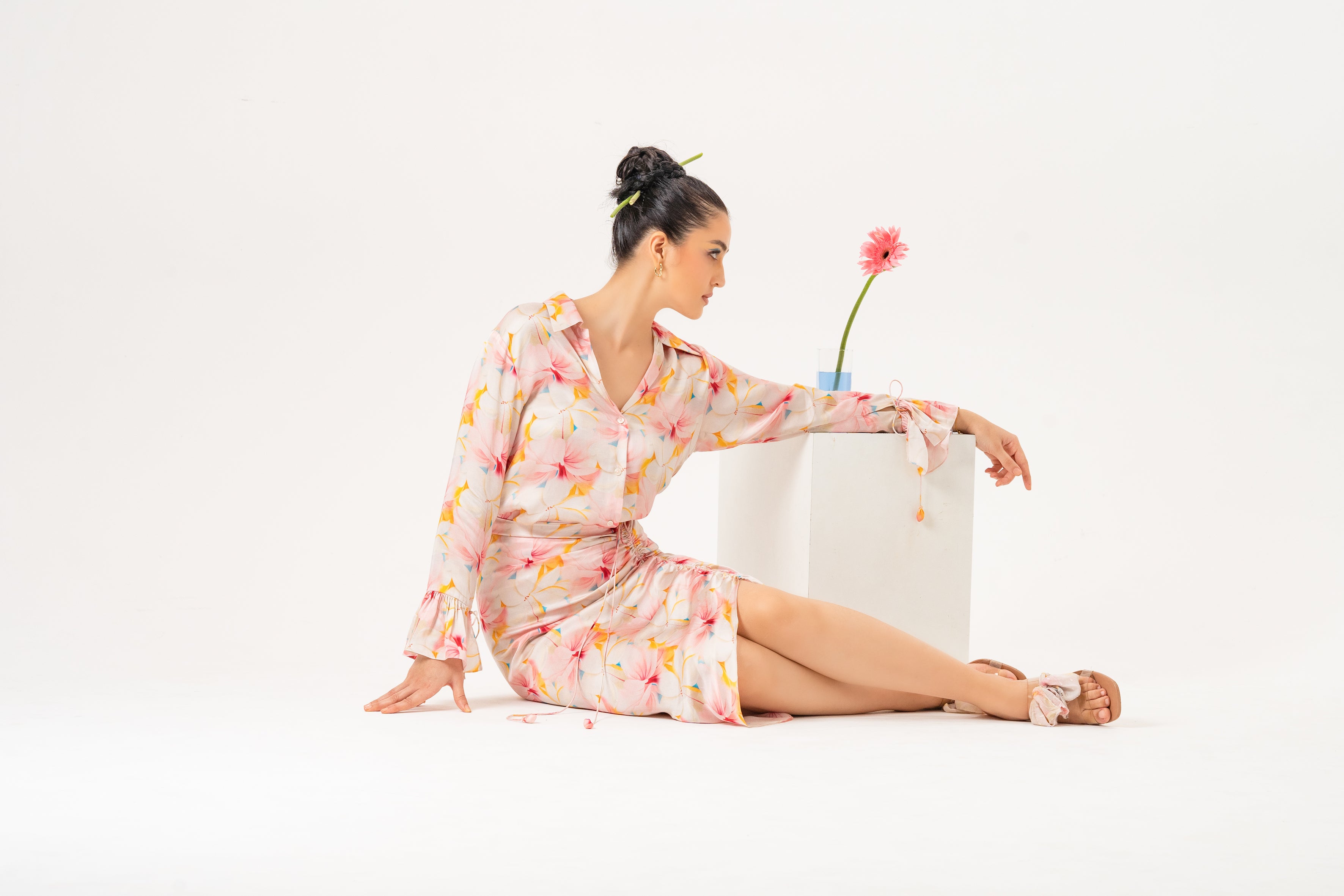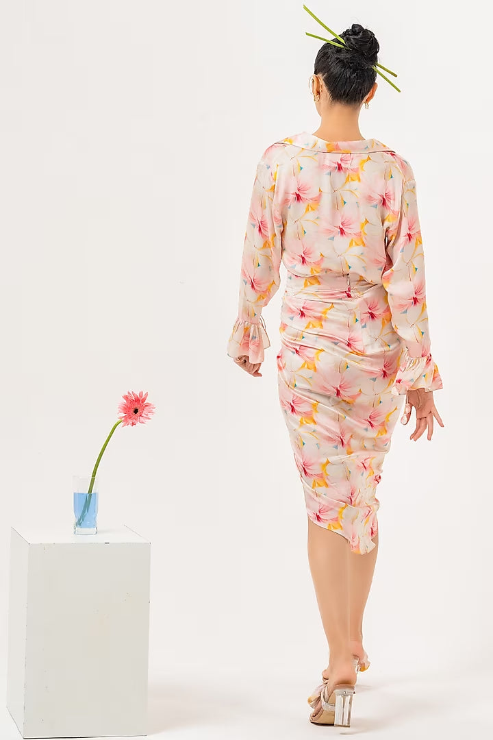 Jasud printed shirt with gathered cuff and tieup details at the sleeves paired with side pulled string details.