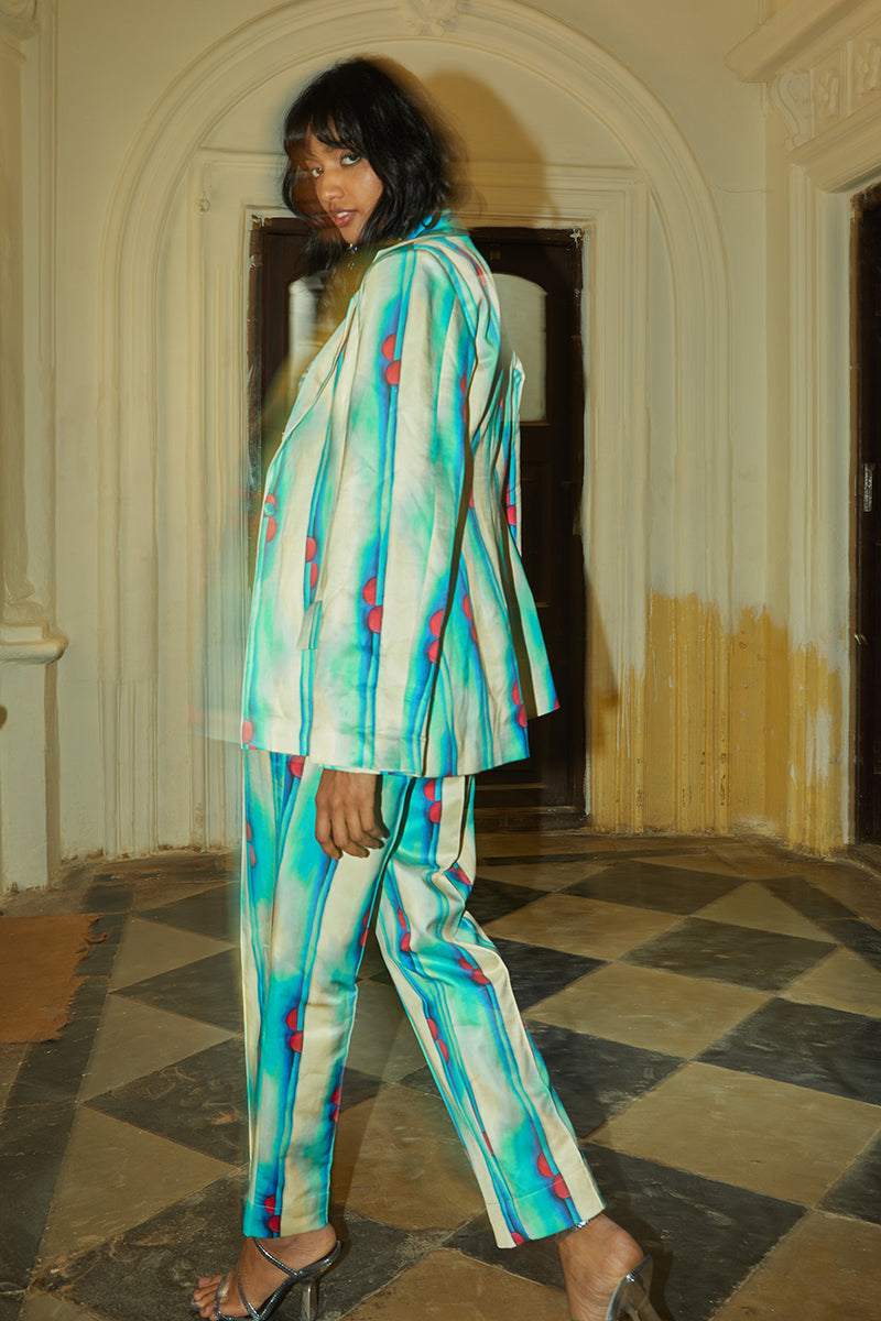 Blue lines and red dots bustier in wrinkle with blazer and pants in mashru