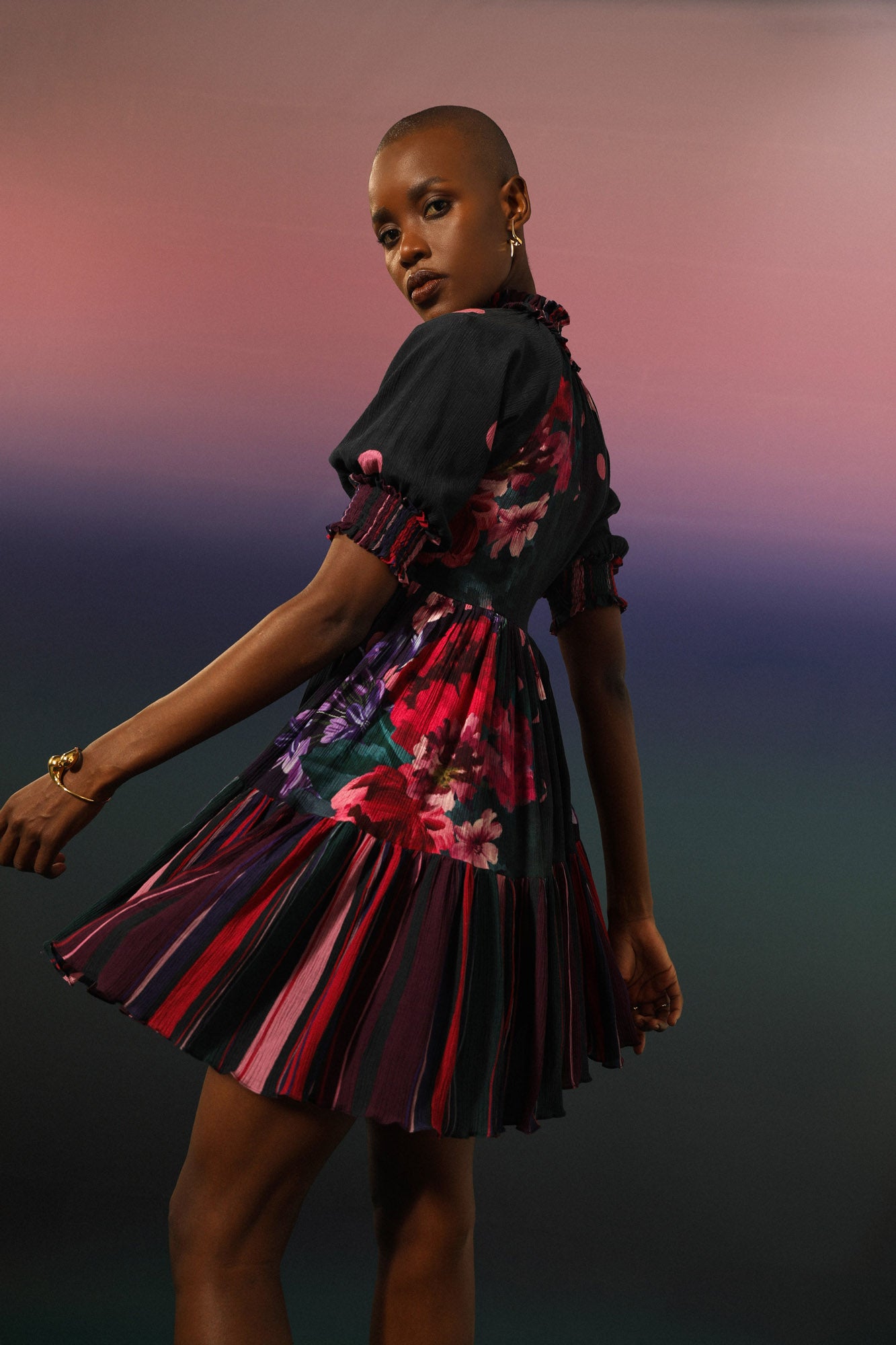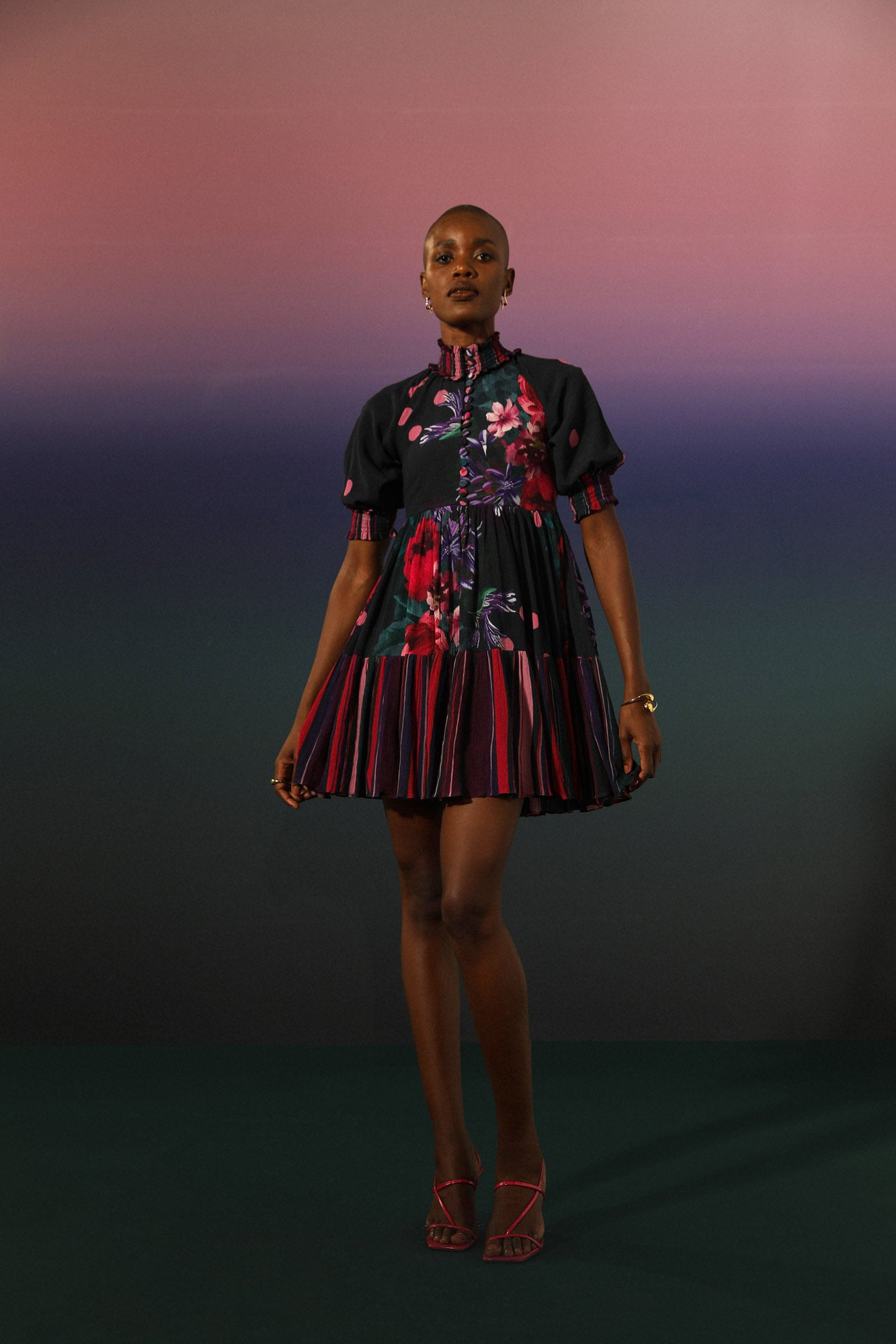 Embrace understated elegance with our Floral Stripe Sundress . Featuring a classic button down front and a smocked collar for a refined touch , this dress is enhanced with a stripe layer that adds contemporary flair. Ideal for versatile styling , it combines classic charm with modern details for a chic and comfortable look.