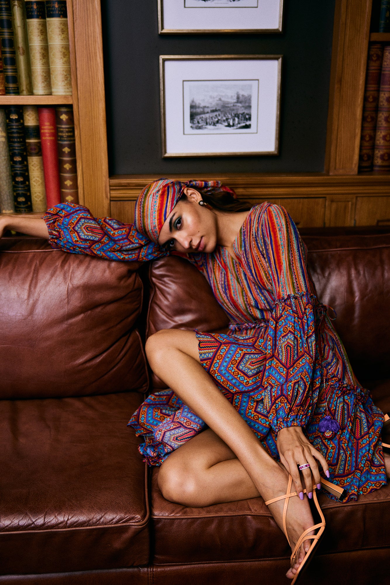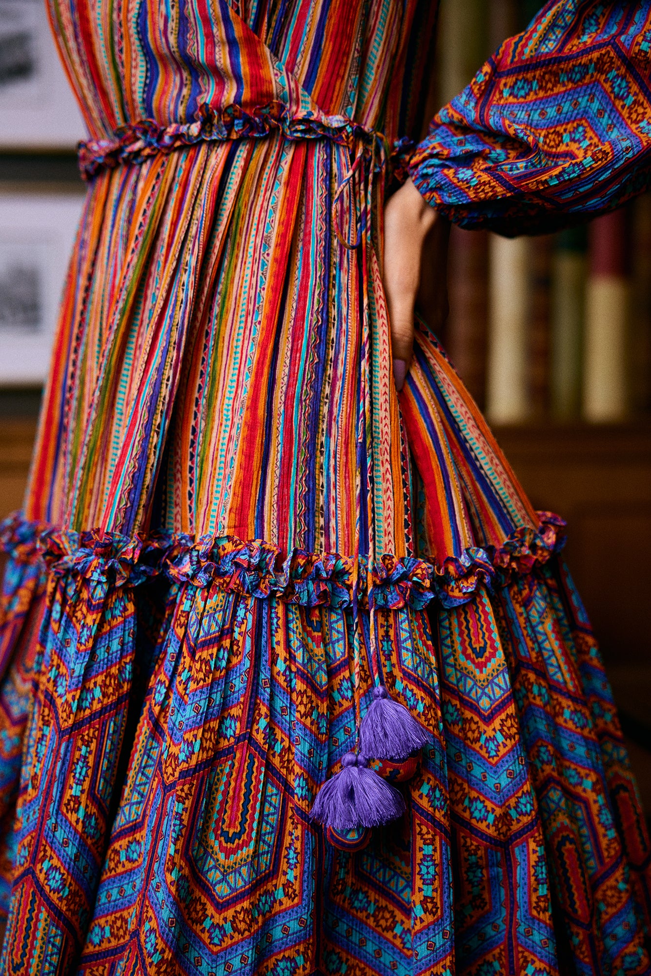 Vibrant hued abstract printed tiered full sleeves boho dress with dreamy frills and hand pleated yoke details