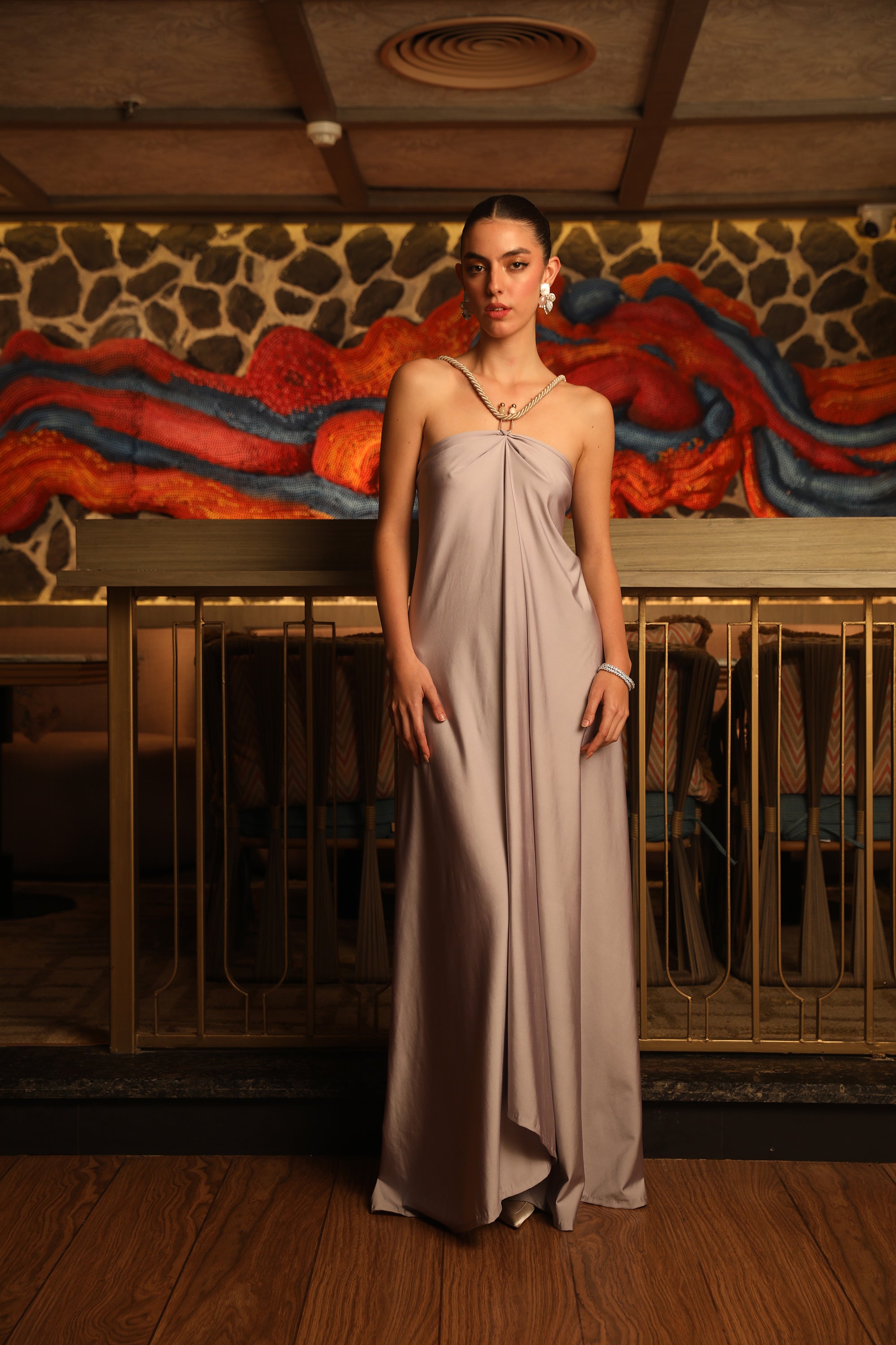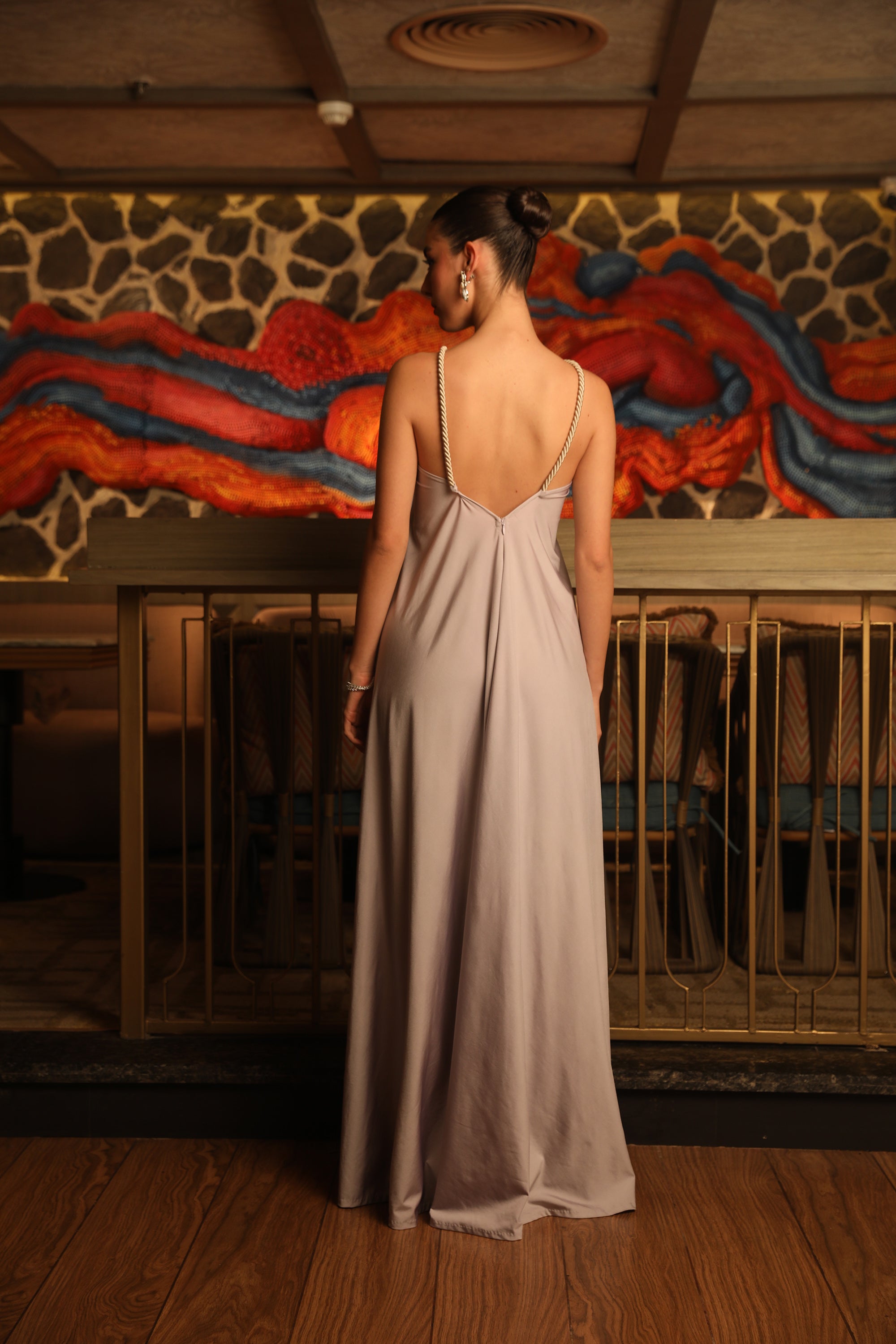 Sleek and sophisticated, this dress captures the essence of modern luxury with a high-fashion twist. Featuring delicate noodle straps that elegantly wrap around the neck and a daring side slit, it’s the ultimate in chic comfort and style.