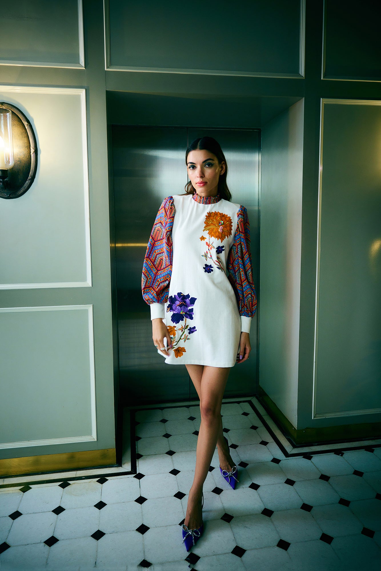 White luxe french terry straight dress with abstract printed smocked collar and gathered sleeves. It has floral applique embroidery.
