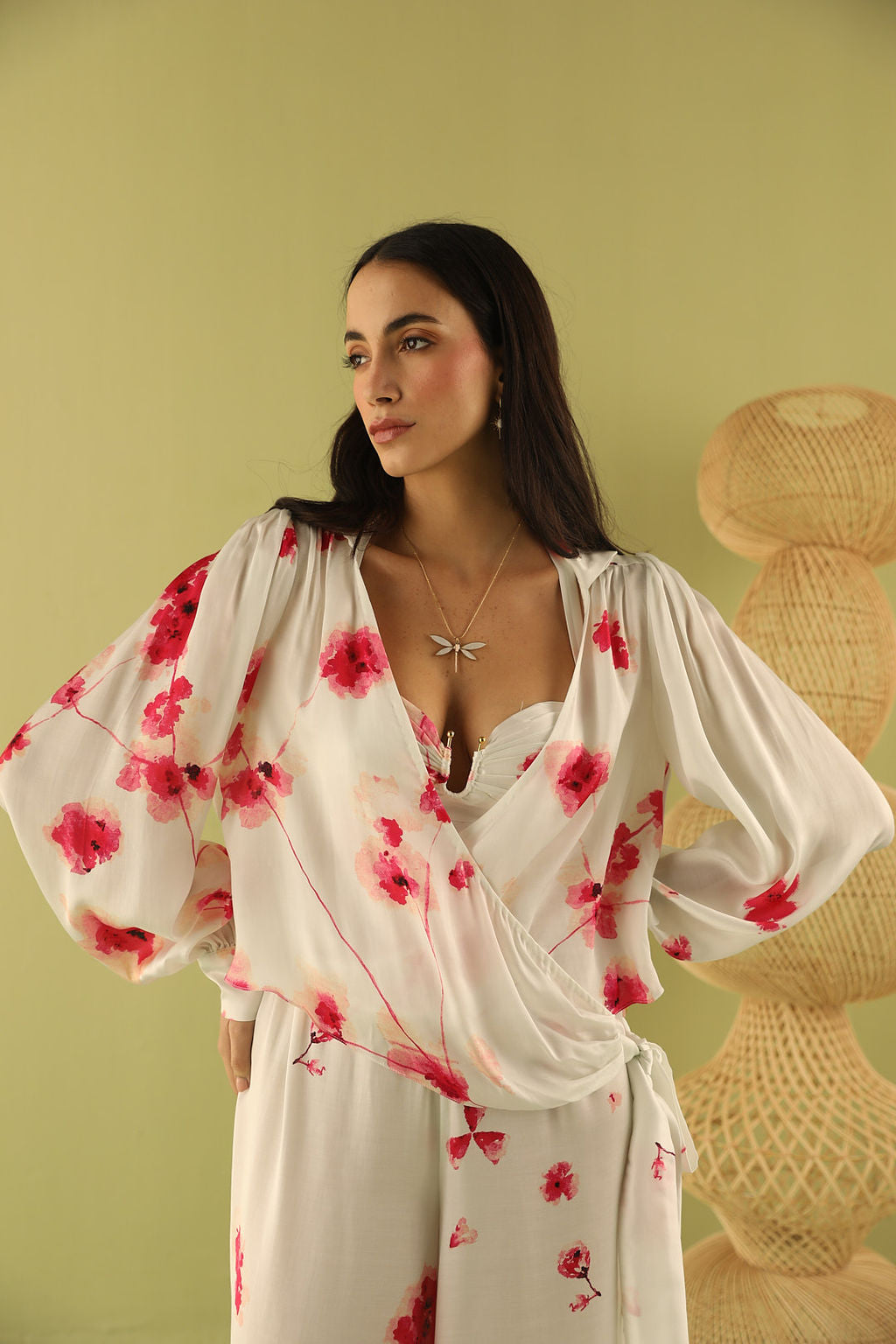 This ensemble features a relaxed, overlap top with a side-knot detail, paired with a stylish bralette adorned with sleek accessories and flattering flared pants. The look seamlessly combines modern elements with a laid-back silhouette, offering the perfect balance of chic sophistication and effortless comfort.