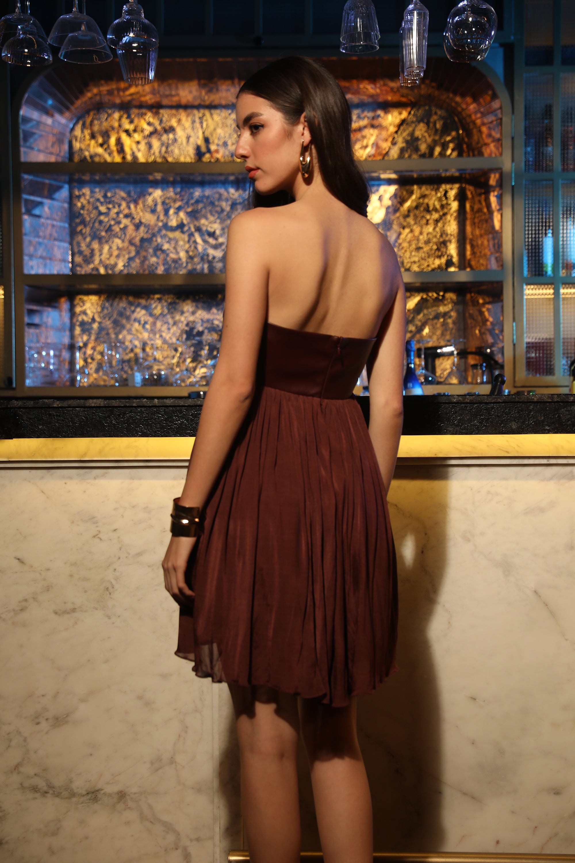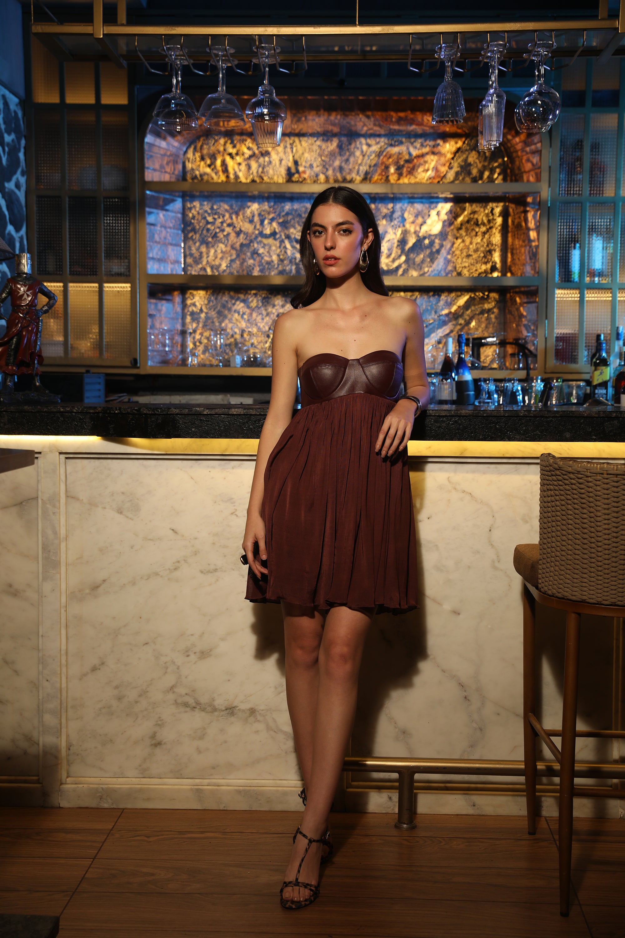 This winter, elevate your style with our Wine Berry Dress. A strapless design with a flattering sweetheart neckline, featuring a luxe leather bralette and a meticulously gathered lycra skirt in a rich berry-chocolate hue. If looking effortlessly cool is on your New Year's resolution list, this dress has you covered.