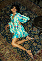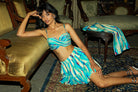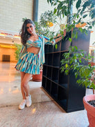 Blue lines and red dots bustier and 1 layer tiered skirt in wrinkle with Shirt in Crepe Silk