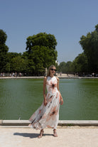 This statement midi dress features a sculpted corset-style bodice that contours the silhouette, offering a flattering and structured fit. The halter neckline highlights the shoulders, while the pleated skirt adds dimension and movement. Adorned with bold, oversized floral motifs in soft blush and charcoal tones, this piece brings together artful printwork with a refined shape—ideal for daytime events or destination soirées.