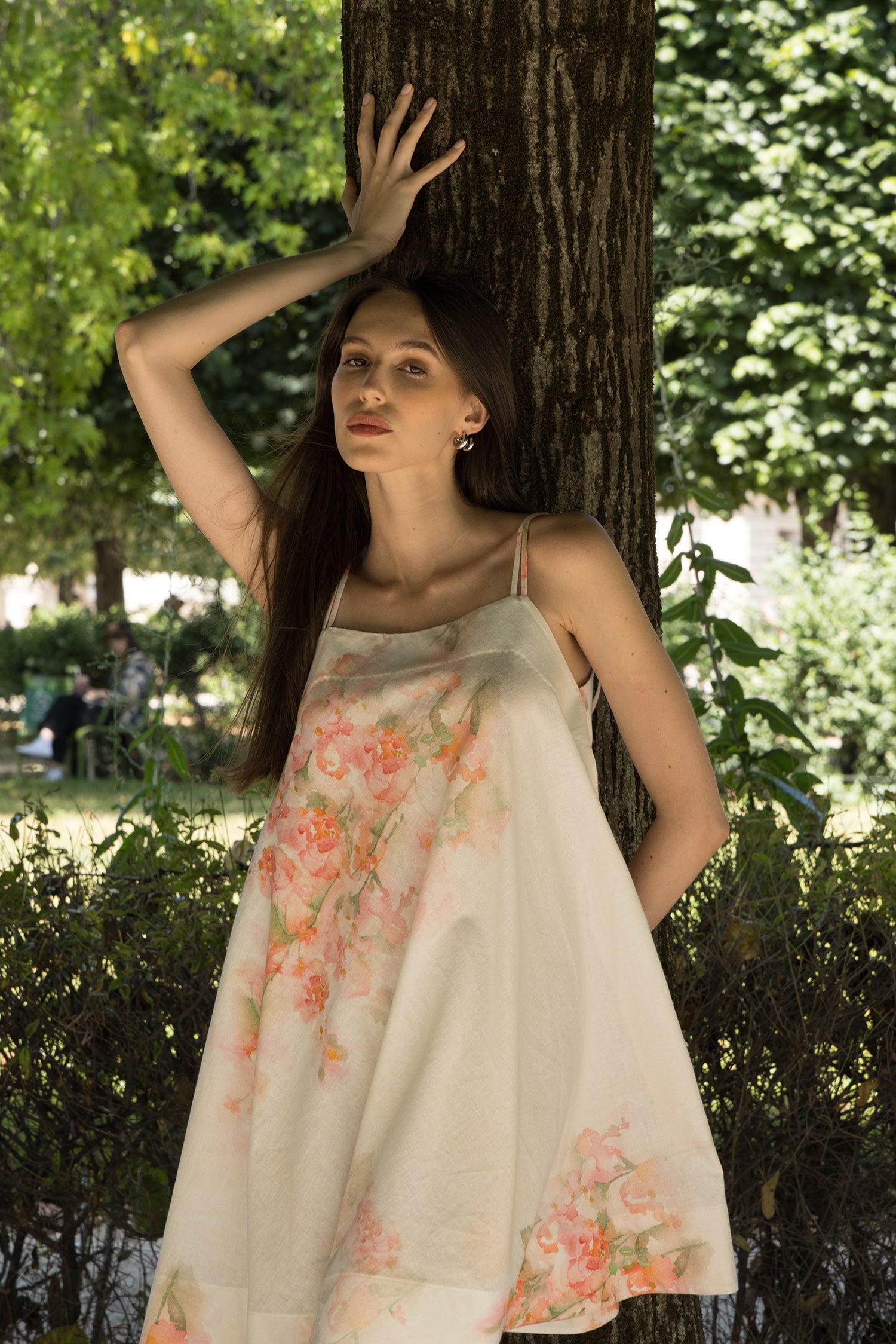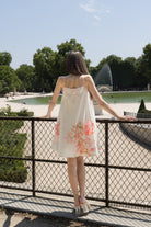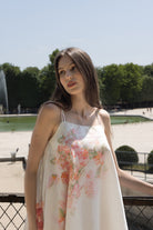 A dreamy ode to springtime, this delicate A-line dress by Khushbu Rathod Label is crafted in a lightweight, flowy fabric that drapes beautifully. Featuring a soft square neckline and slim shoulder straps, the silhouette falls gently over the body for an effortlessly feminine look. The pastel floral print in shades of blush, peach, and soft green adds a romantic touch, while handmade tassel detailing at the end of the straps adds an artisanal finish. Perfect for daytime events, garden parties, or resort brunches.