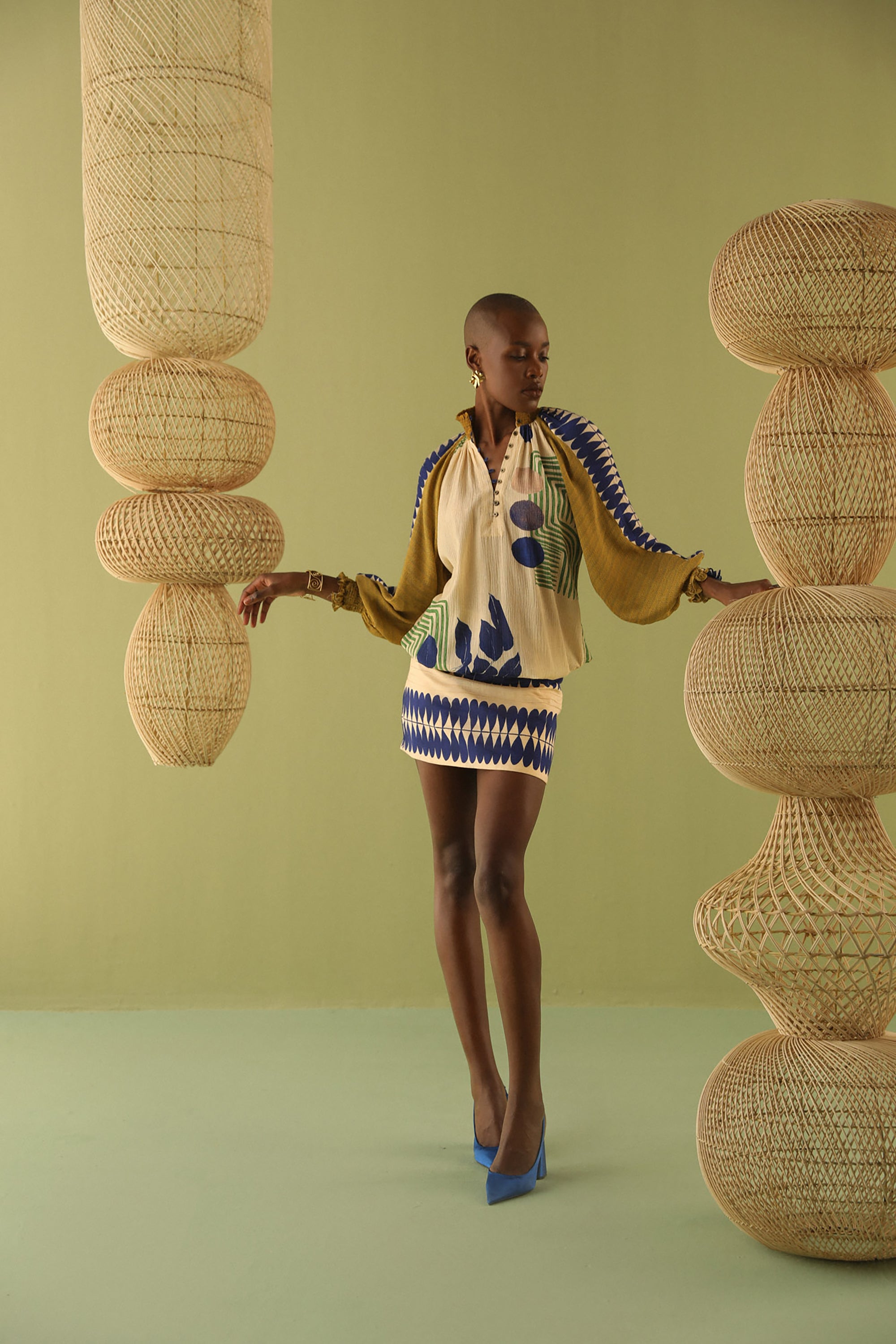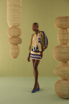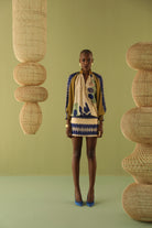 The Desert Sleek Dress features a smocked collar and a fitted bottom, offering a flattering silhouette. The standout placement print adds a unique touch, making this chic, short dress a perfect blend of elegance and modern flair.