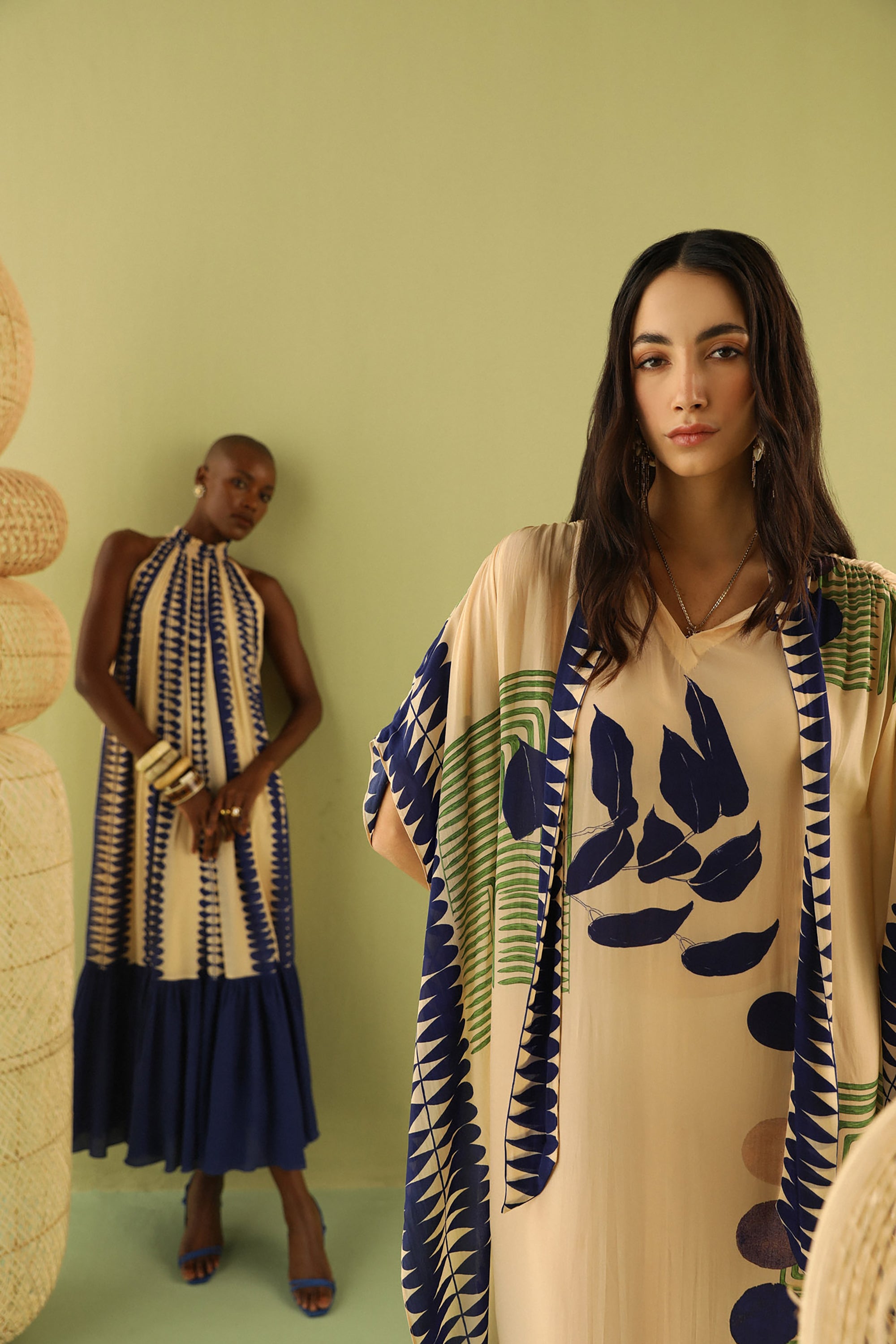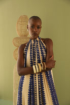 Embrace effortless style with the Palm Grove Maxi, featuring a flattering halter neck and a flowing, floor-length design. The serene blue fabric, adorned with a subtle leaf print brings a sophisticated charm to your look. Ideal for any occasion, this dress combines classic elegance with modern grace.