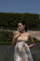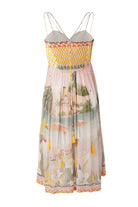 A breezy, vacation-ready mini dress that captures the essence of coastal charm. Featuring a pleated bodice with a vibrant scenic print, the dress is designed with a sweetheart neckline and delicate shoulder straps for a feminine silhouette. The smocked back provides a comfortable, flexible fit, while playful tassel ties at the back add a subtle bohemian touch. This easy-going mini is perfect for sun-drenched getaways and relaxed resort evenings.