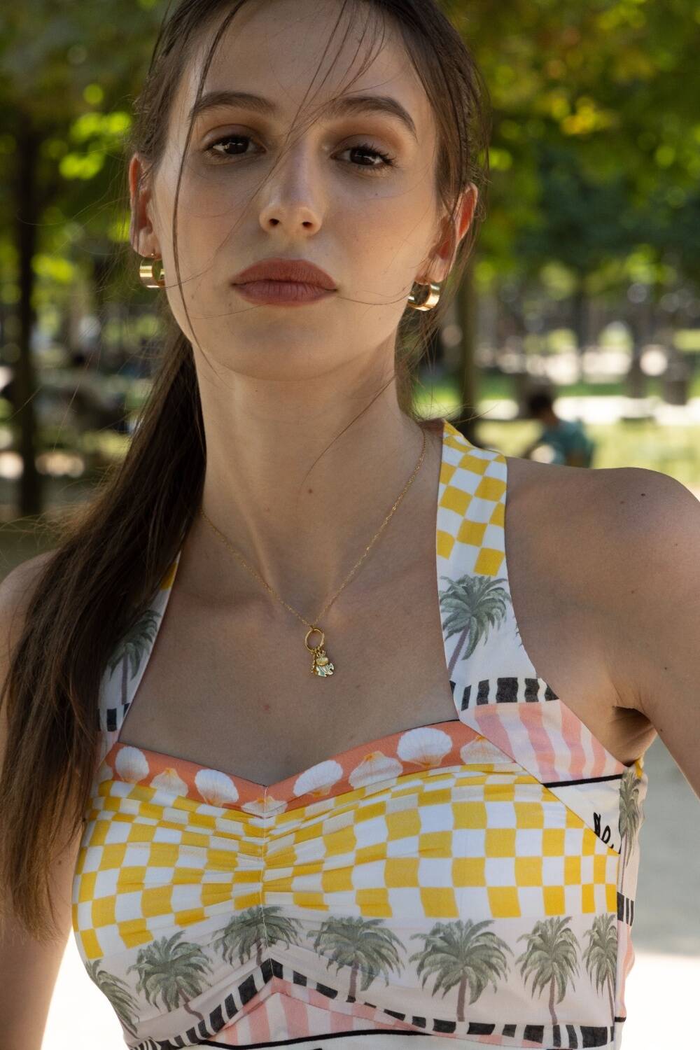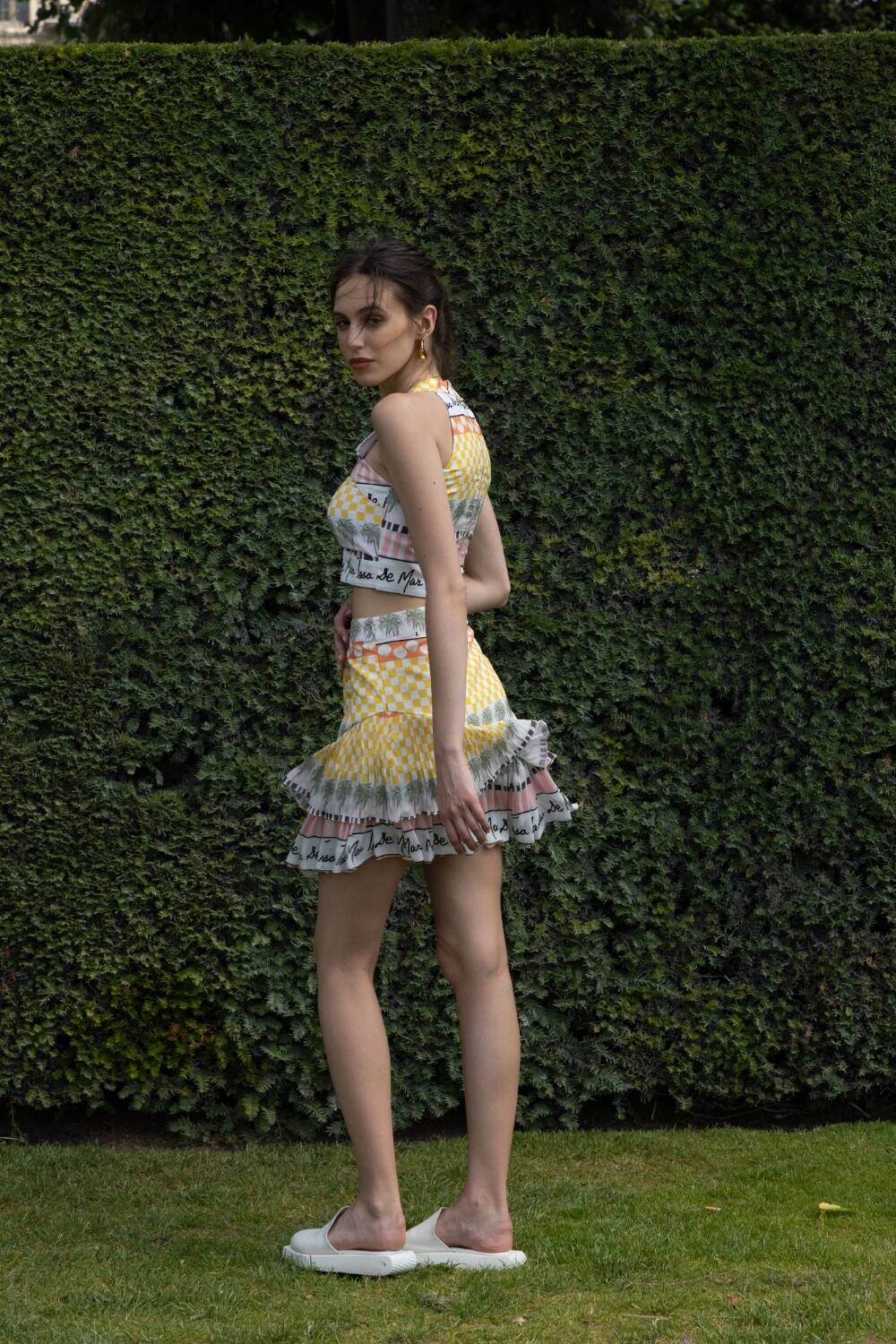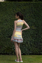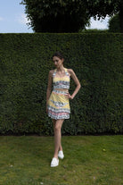 A vibrant wardrobe essential, this printed bralette features a Ruched bust, halter neckline, and structured silhouette for a flattering fit. The playful mix of yellow checks, soft pastels, and palm motifs brings a touch of tropical charm. Pair it with the matching scenic skirt for a co-ord moment.