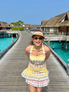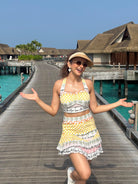 A vibrant wardrobe essential, this printed bralette features a Ruched bust, halter neckline, and structured silhouette for a flattering fit. The playful mix of yellow checks, soft pastels, and palm motifs brings a touch of tropical charm. Pair it with the matching scenic skirt for a co-Ord moment.