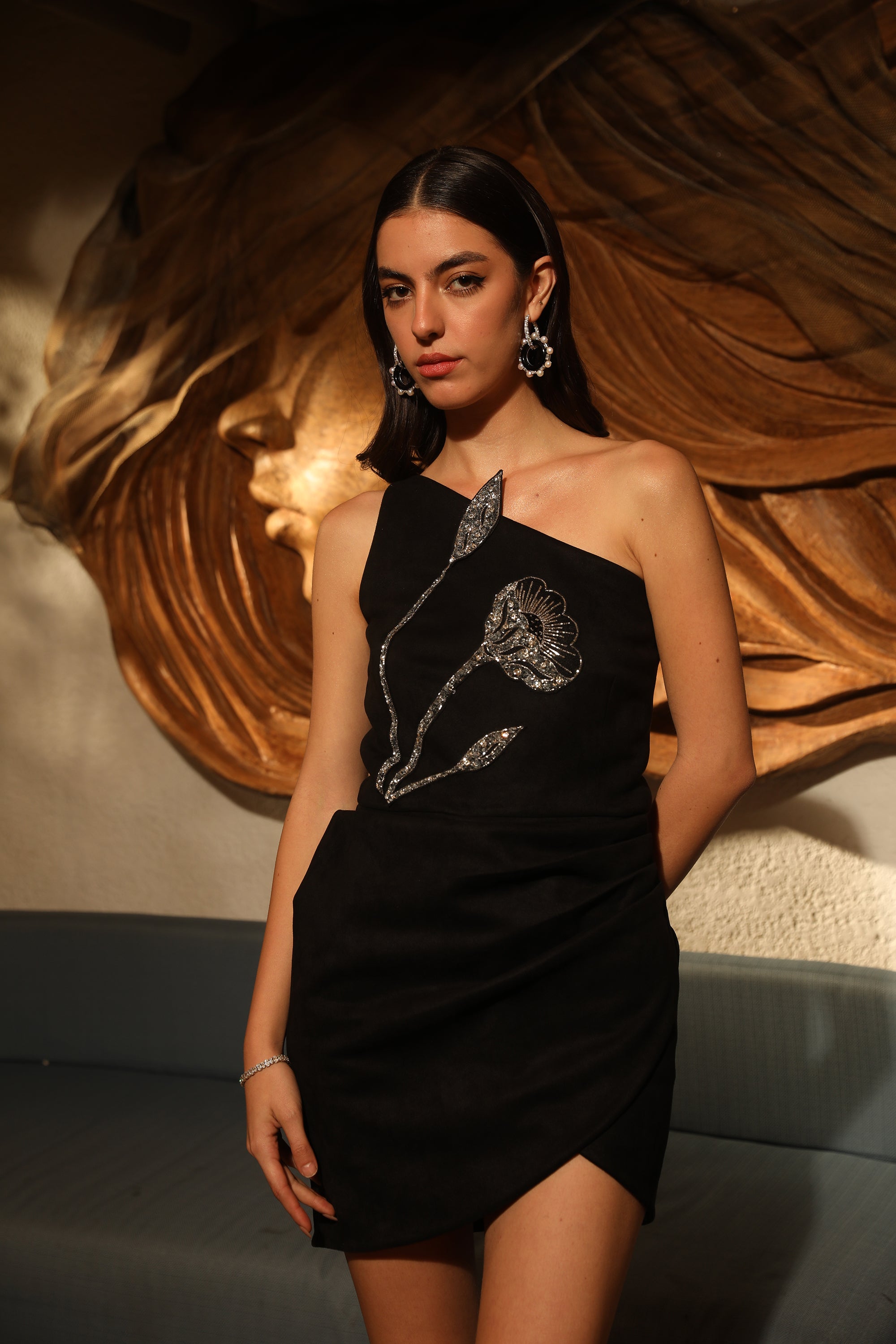 Turn heads this season in our Lunar Petal Dress. This sleek, one-shoulder design features a fitted bodice adorned with a sparkling silver-grey sequinned floral patch, paired with a draped asymmetrical skirt for a modern, elegant look. Step into winter with confidence and embrace your bold new style.