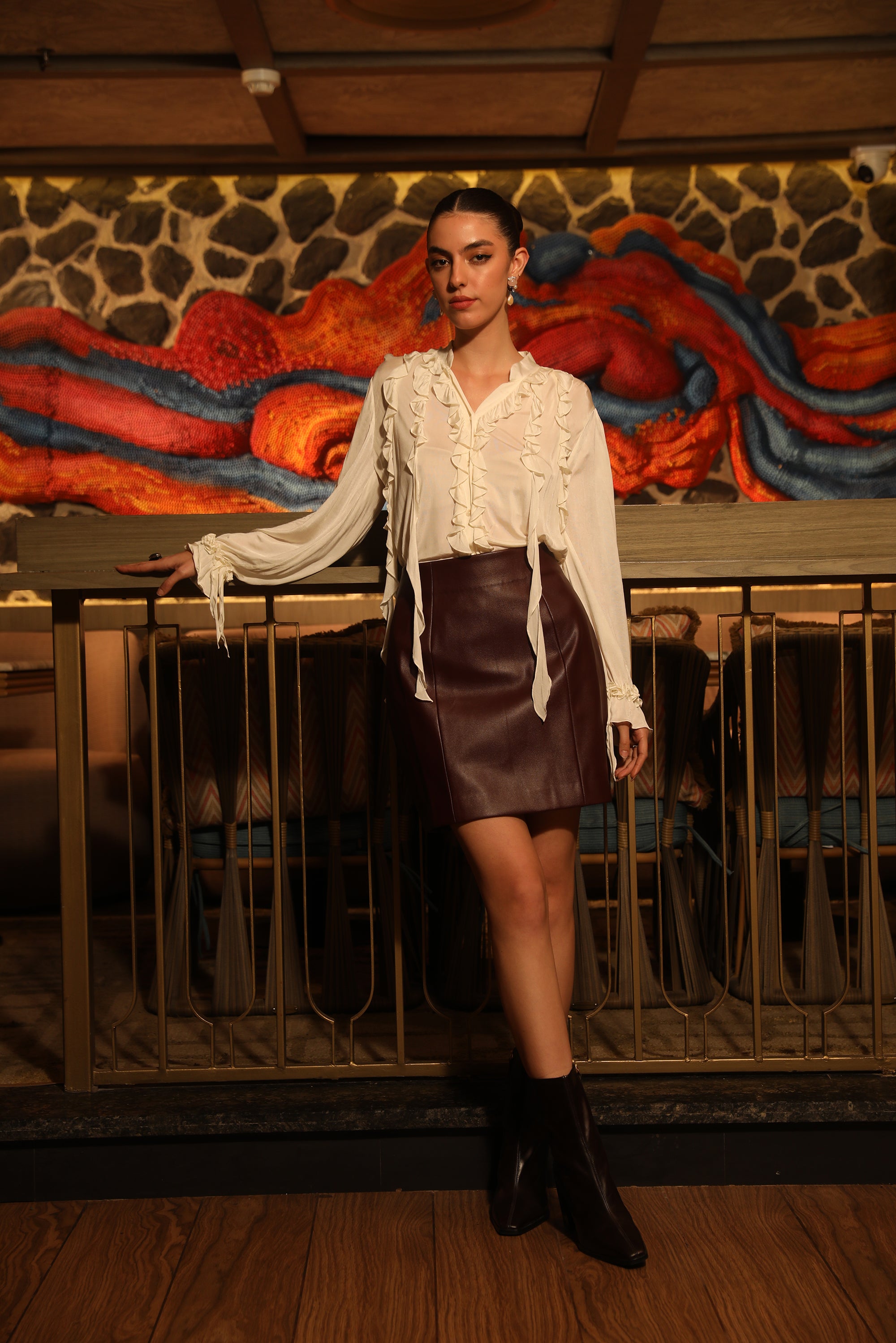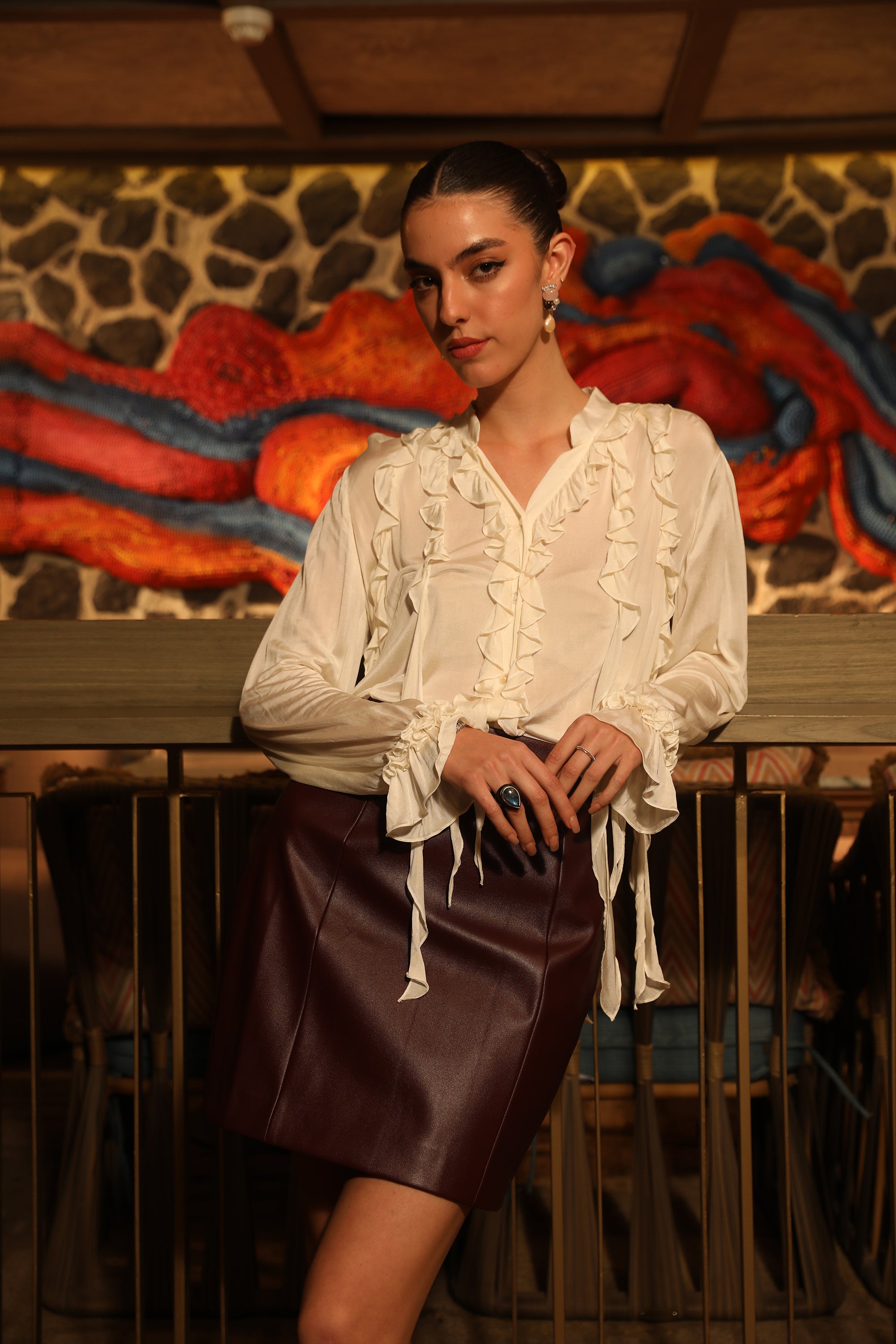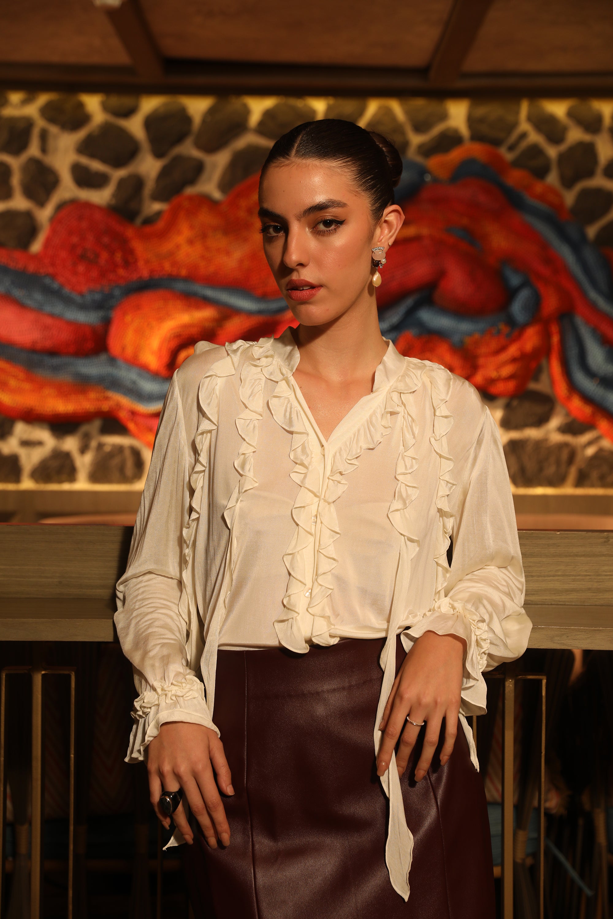 In a soft pearl cream shade, The Pearl Cascade Blouse is the ultimate versatile piece for any occasion. Whether you're brunching with friends or heading to a night out, this blouse is a must-have for every trendsetter. It features ruffled lantern sleeves, cascading ruffle details, and a refined Chinese collar, making it the perfect balance of chic and playful.